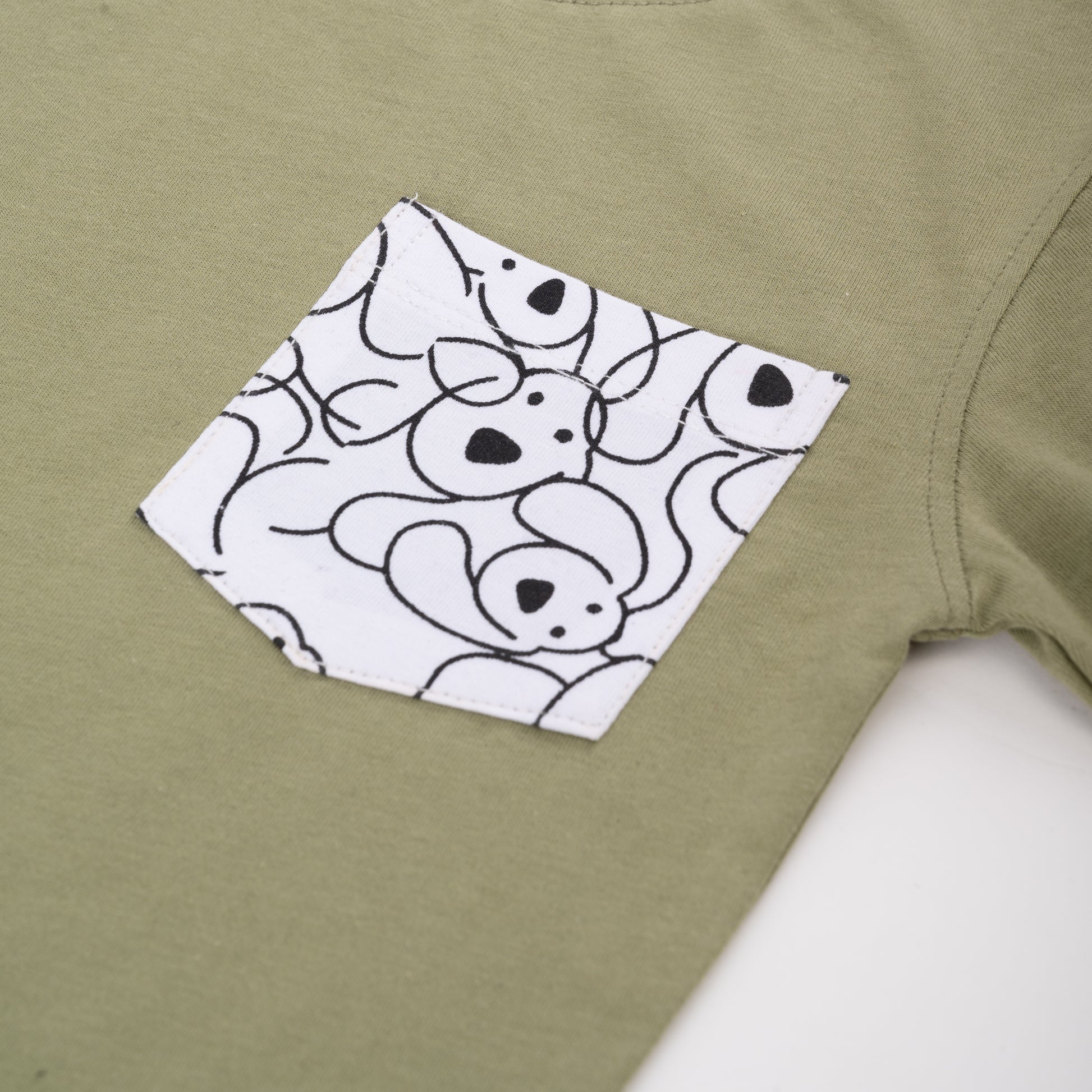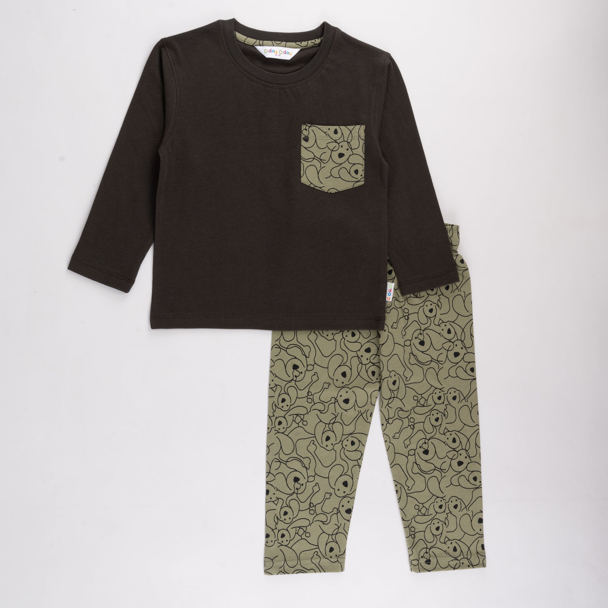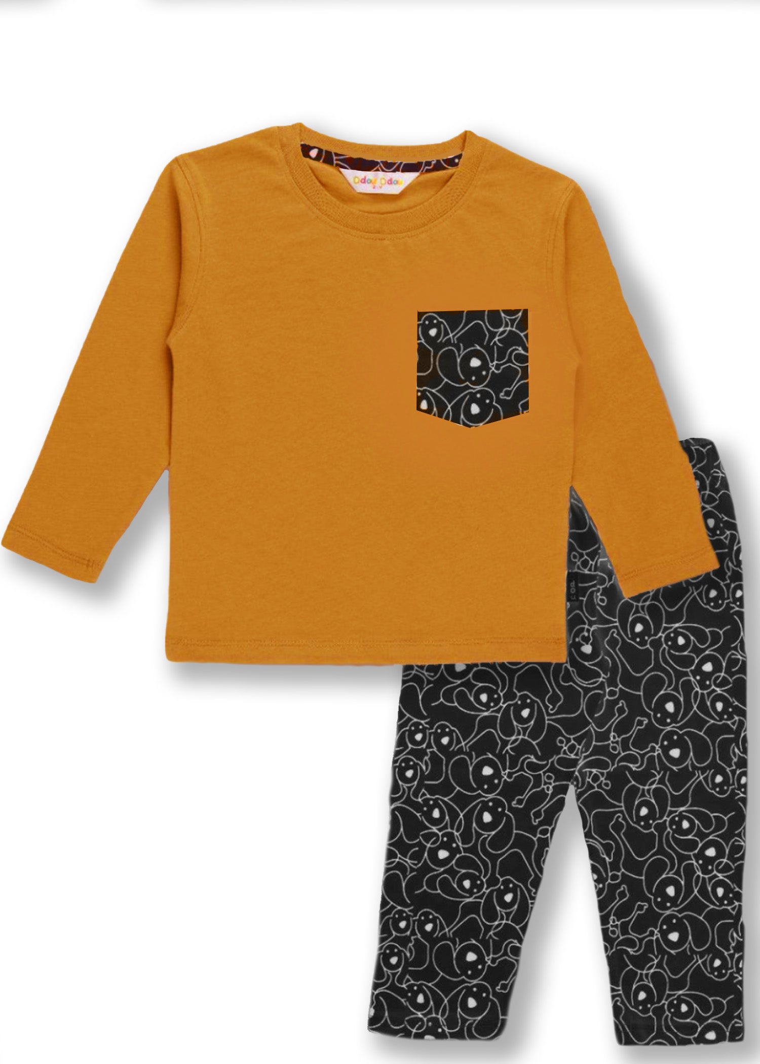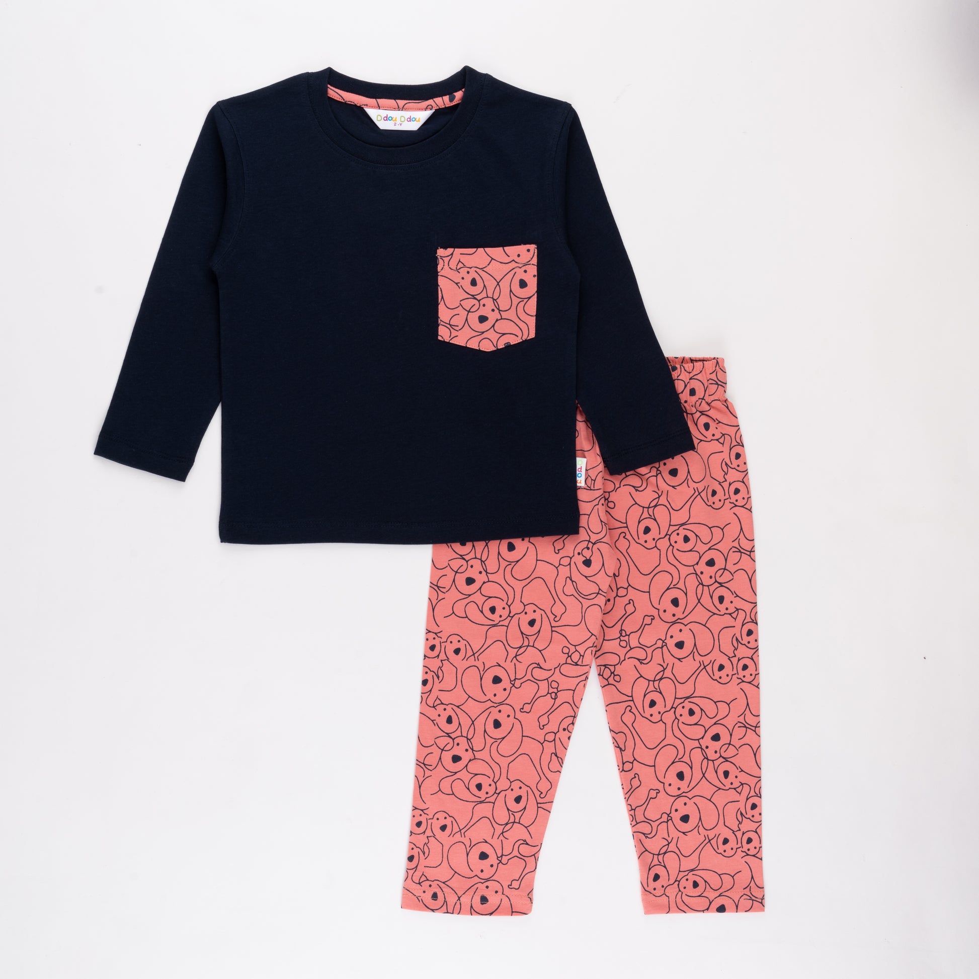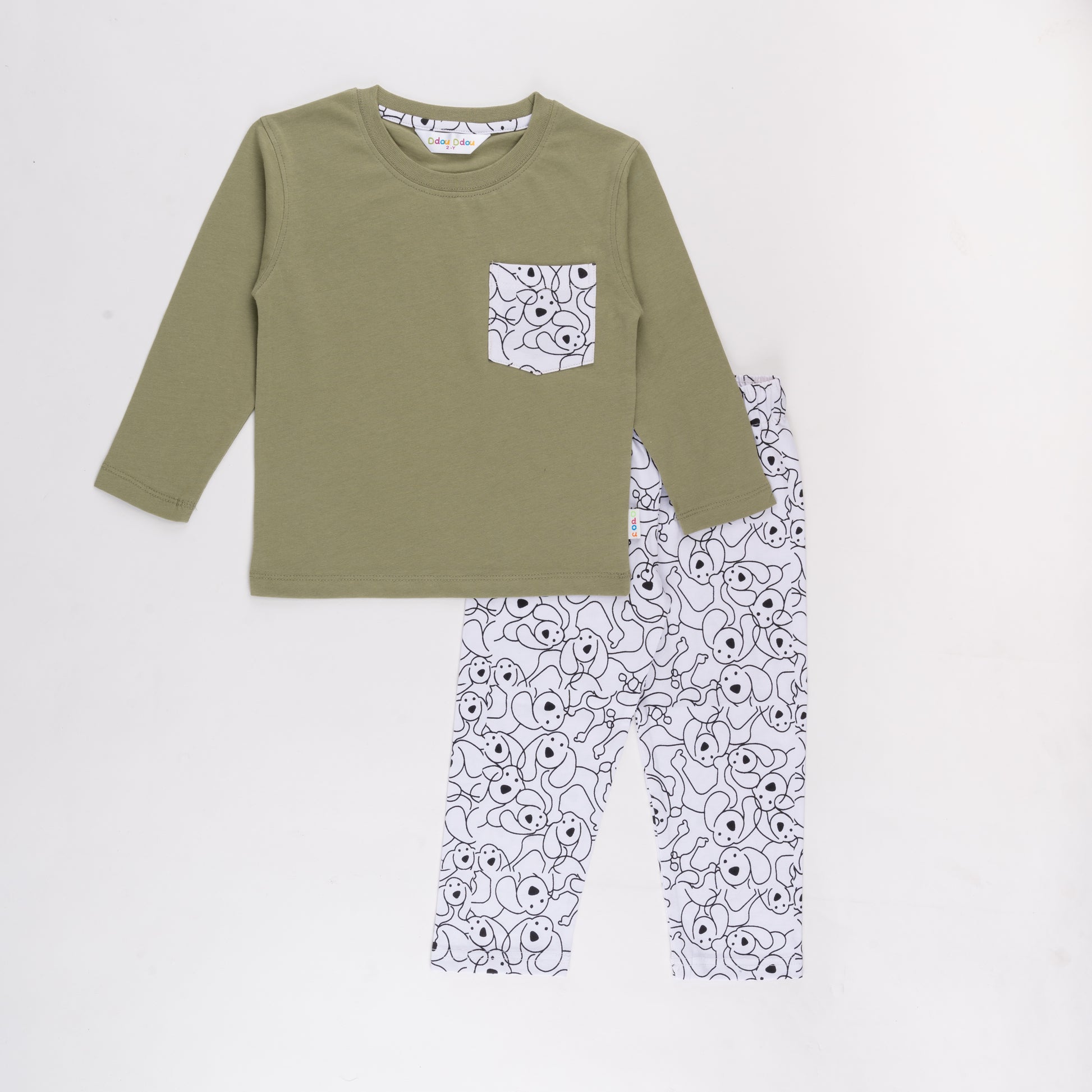 Stay comfy and cozy all night long in this fun Dog Doodle Night Suit. Made with printed cotton fabric and a covered elastication for a snug fit, the full-sleeved tops feature a printed pocket on the front for a unique touch. Get ready to howl with laughter!