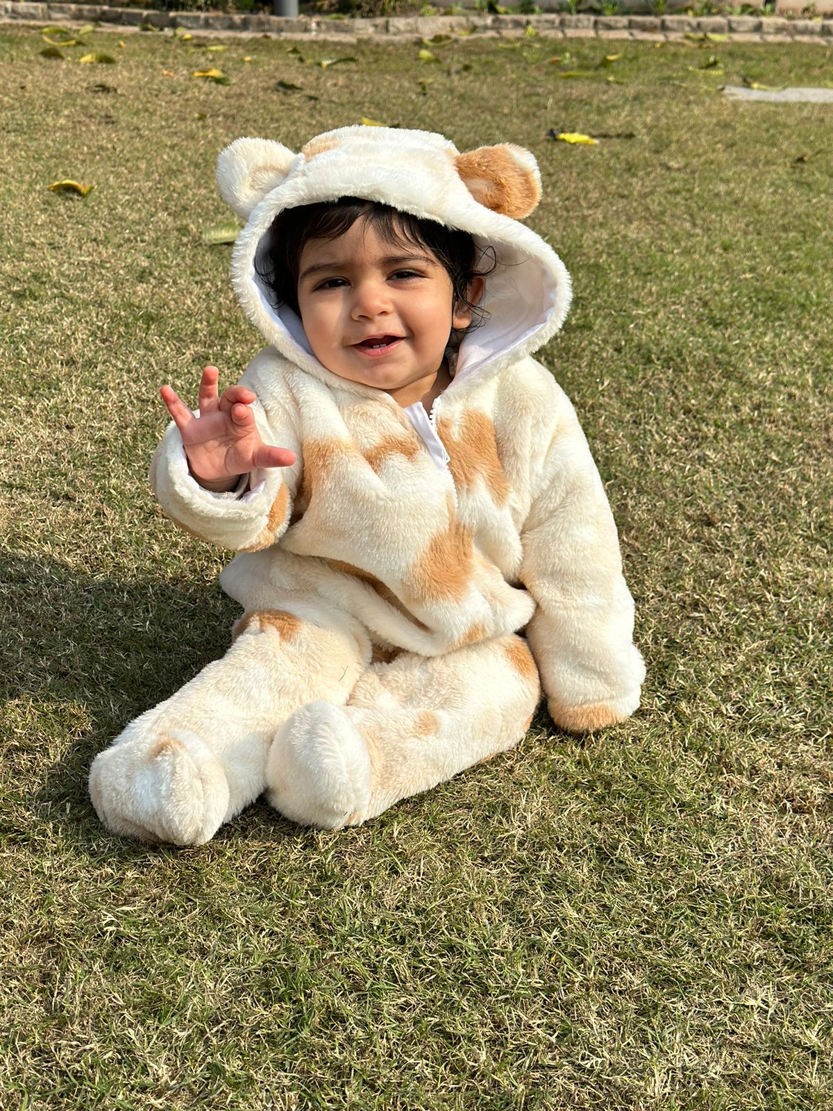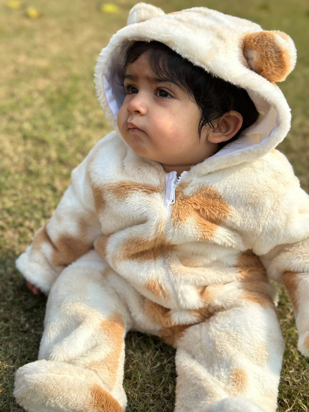 Get ready to snuggle up in this Teddy bear Romper! Made with 100% cotton fabric on the inside, your baby's soft skin will feel warm and cozy. With an adorable hood featuring cute teddy bear ears, your little one will be ready for hugs all day long. The fur fabric on the outside adds a playful touch to this baby essential.